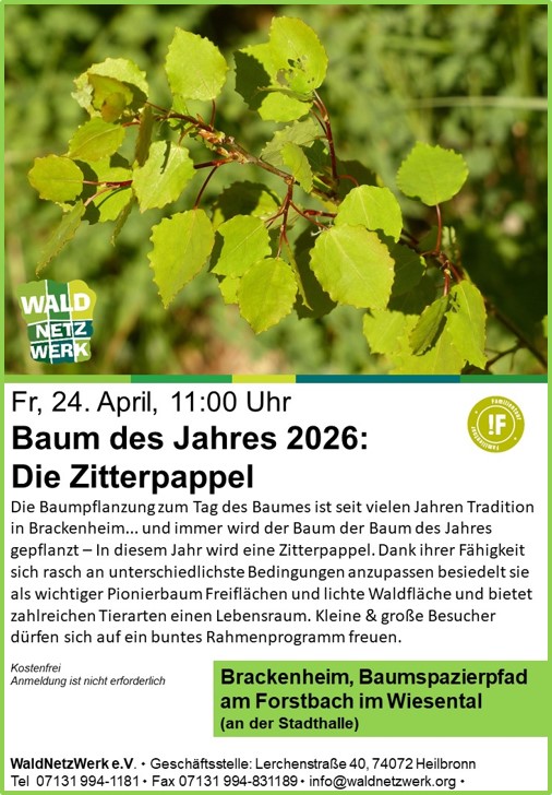 Am Freitag, 24. April, 11:00 Uhr feiern wir gemeinsam mit dem Theodor-Heuss-Museum den Tag des Baumes – mit der Pflanzung der Zitterpappel, Baum des Jahres 2026!