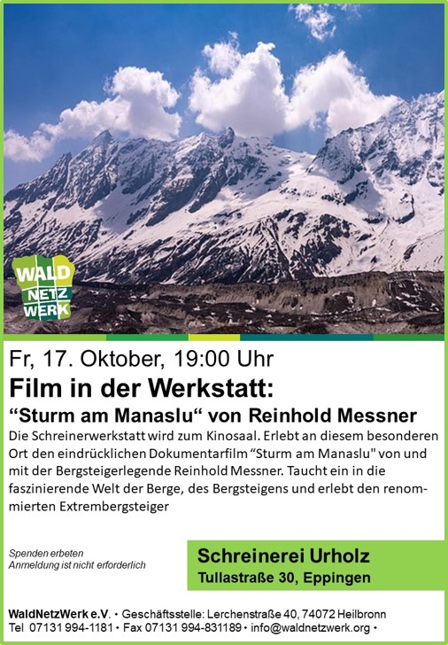 Das WaldNetzwerk-Kino öffnet in der Schreinerei Urholz in Eppingen seine Pforten. Am Freitag, 17. Oktober zeigt das WaldNetzWerk den Film „Sturm von Manaslu“ von und mit der Bergsteigerlegende Reinhold Messner. Der Film zeigt die faszinierende Welt der Berge, des Bergsteigens und reist in die Vergangenheit des Bergsteigers.